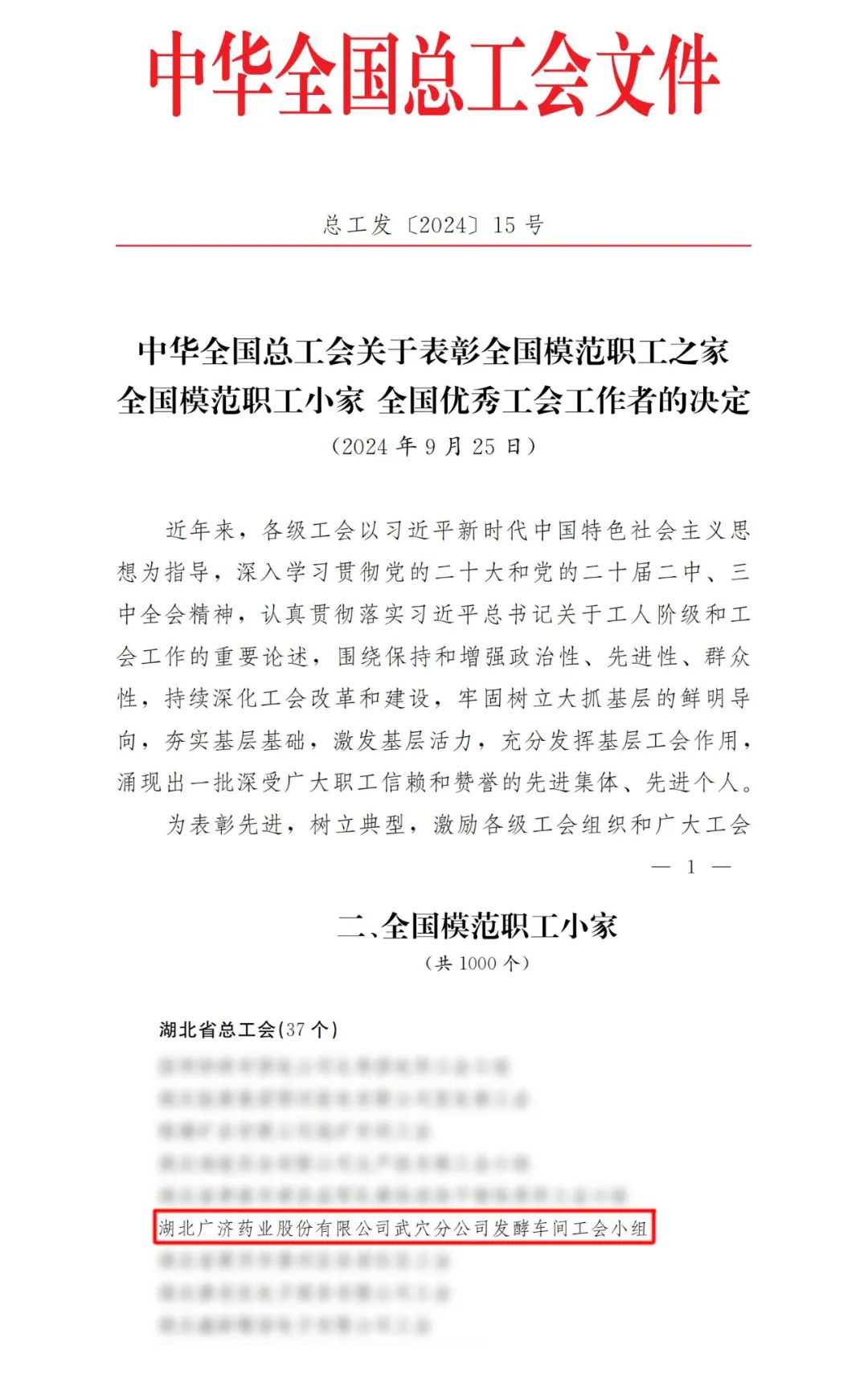 武穴分公司发酵车间工会小组获“全国模范职工小家”称号。